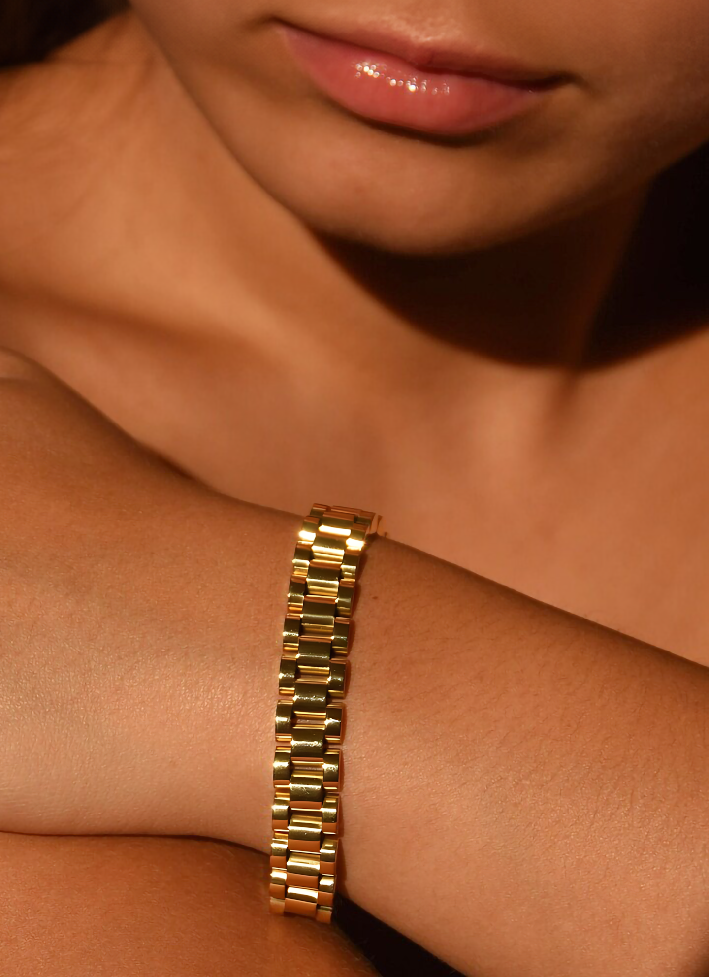 Bransoletka Genevieve, platerowana 18-karatowym złotem, wysokiej klasy design, długość 18 cm (możliwość skrócenia), szerokość 1 cm.